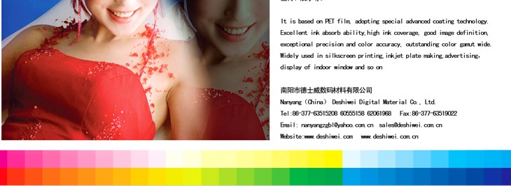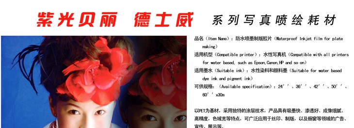 ·Digital ink-jet materials are compatible with all thermal and piezo desktop and large format ink-jet printers with broad applications of graphic arts, ads display and screen printing etc.